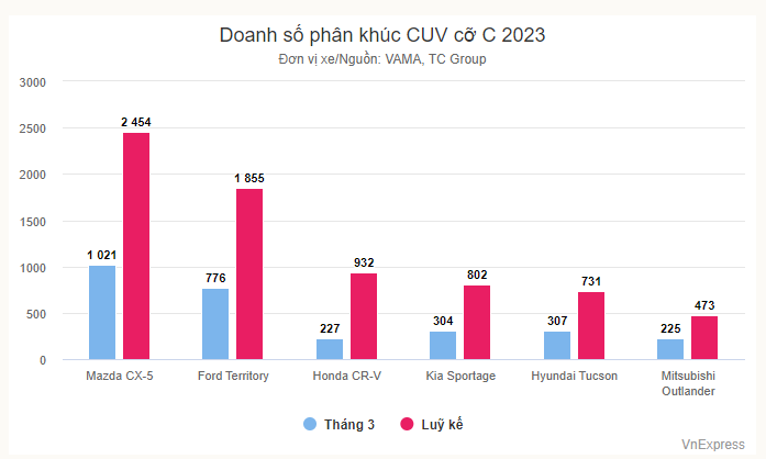 Sau 3 tháng đầu 2023, Territory bán 1.855 xe, riêng tháng 3 là 776 xe. Mẫu xe không có tháng nào bán hơn 1.000 chiếc như CX-5 nhưng ổn định, trung bình hơn 500 xe/tháng.
